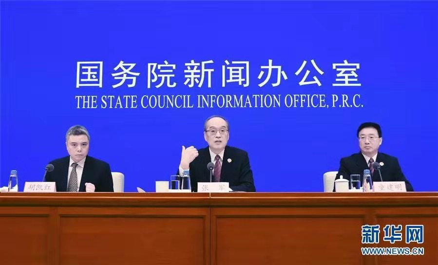 2019年1月3日,国务院新闻办公室在北京举行新闻发布会,请最高人民检察院检察长、首席大检察官张军(中),最高人民检察院副检察长、二级大检察官童建明(右)介绍最高人民检察院改革内设机构,全面履行法律监督职能有关情况,并答记者问。潘旭 摄